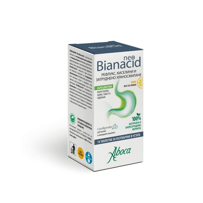 Aboca NeoBianacid При киселини и рефлукс представлява медицинско изделие, облекчаващо симптомите на киселини и рефлукс. Абока НеоБианацид оказва положително въздействие при киселини, болки и парене в стомаха. Продуктът е подходящ за облекчаване на проблеми, свързани с храносмилането, и за защита в ситуации, които биха могли да доведат до раздразнение на лигавицата.