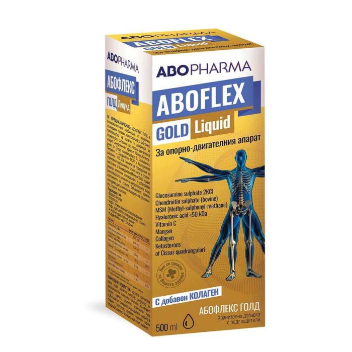 AboPharma Aboflex Gold liquid е висококачествена и ефективна хранителна добавка, благоприятстваща състоянието на ставите и на целия опорно-двигателен апарат. АбоФарма Абофлекс Голд сироп за стави 500 мл се отличава със своята специална течна формула, която се усвоява бързо и пълноценно от тялото. Тя съдържа нискомолекулна хиалуронова киселина 50 kDa, създадена специално в течна форма за орален прием, както и оптималната комбинация от Манган, кетостерони от Iissus quadrangularis L, МСМ, Хондроитин, Глюкозамин, допринасяща за здравето на опорно-двигателния апарат. Сиропът спомага за доброто състояние, здравината и нормалната функция на ставите, костите и хрущяла, за синтеза на съединителна тъкан и колаген. Освен това облекчава умората и усещането за отпадналост. Препоръчва се за хора в напреднала възраст, хора, извършващи тежък физически труд, за лица, претърпели интервенции на ставите и опорно-двигателния апарат, за спортисти. За възрастни и деца над 12 години.