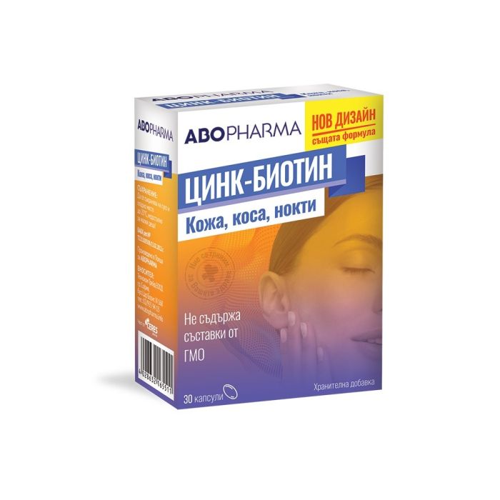 AboPharma Zink + Biotin е висококачествена и ефективна хранителна добавка, благоприятстваща състоянието на косата, кожата и ноктите. АбоФарма Цинк-Биотин 30 капсули се отличава със специалната си формула с цинк и биотин. Цинкът е минерал, заемащ ключова роля в метаболитните процеси и в производството на енергия. Той се отразява благоприятно на косата, кожата, ноктите, зрението и повишава имунитета. Освен това предпазва клетките от свободните радикали благодарение на антиоксидантния си ефект и спомага за нормалния синтез на ДНК. Другата актияна съставка в добавката - биотин (витамин B7), играе важна роля в обмена на въглехидратите, в производството на енергия, в синтеза на мастните киселини. Освен това спомага за синтеза на витамин Ц, за метаболизма на макро хранителните вещества. Спомага и за доброто състояние на косата и кожата. Без консерванти. Без ГМО.