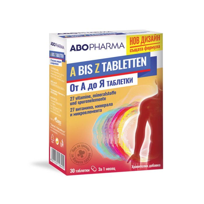 AboPharma A bis Z Витамини и минерали от А до Я представлява висококачествена и ефективна хранителна добавка, осигуряваща ежедневното количество от витамини и минерали, необходими за доброто здраве на организма. АбоФарма А биз З Витамини и минерали от А до Я се отличава със своята специална формула, включваща 27 витамина, минерала и микроелемента. Сред тях е витамин Д във форма, която лесно се усвоява от организма. В същото време използваната за разработването на продукта технология Adept Solidis подсигурява запазването на витамините D и Е в таблетките, както и максималното им усвояване от тялото. Добавката подпомага имунната система, осигурява енергия и тонус, спомага за предпазване от негативните ефекти върху тялото от физическото и психическото натоварване. Препоръчва се при стрес, повишена опасност от вирусни и бактериални инфекции, при смяна на сезоните, за възстановяване на оптималното здраве след боледуване, за профилактика. За добро общо здраве. За възрастни и деца над 12 години.