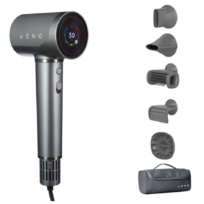 AENO AHD0005G HD5 е първият сешоар с изкуствен интелект. Отличава се с високо качество и множество автоматизирани функции, които имат за цел да защитят косата от увреждане и да улеснят работата с уреда, правейки я интуитивна. Сешоарът предлага 3 режима на работа с по 2 скорости, съобразени с различните типове коса, които предотвратяват топлинното увреждане на косъма. AENO AHD0005G HD5 разполага със сензорен дисплей, който позволява бързо и лесно регулиране на температурата само с едно докосване или плъзгане. Системата за автоматичен контрол на температурата използва изкуствен интелект, който отчита разстоянието на уреда от косата и регулира нивото на температурата, за да предпази от прекомерно нагряване. Така се намалява рискът от увреждане и се гарантира оптимално сушене и стилизиране. Поддържа функция за бързо сушене и функция за йонизация. Функцията за бързо сушене не само спестява време, но и ограничава увреждането и изтощаването на косата. Йонизацията помага за изглаждане на косъма, предпазва от накъсване, намалява наелектризирането на косата и прави оформянето на прическата по-лесно, като увеличава блясъка на косата. AI технологията за автоматично включване и изключване, както и вграденото гласово управление, позволяват бърза смяна на режимите Soft, Hot или Cold, съобразени с вашите нужди. NTC сензорът за термоконтрол предотвратява прегряването, а усъвършенстваната InfraCare технология спомага за заздравяването на косата. Безчетковият мотор е достатъчно мощен, като технологията на безчетковите мотори гарантира устойчивост на по-високи натоварвания и дълготрайна работа на сешоара. С ниско тегло, компактен размер и калъф за съхранение, той е изключително подходящ за пътувания. 360° магнитни приставки се сменят бързо и лесно, позволявайки перфектно стилизиране както в домашни, така и в професионални условия. Накрайникът за стилизиране е подходящ за изправяне на косата и оформяне на по-сложни прически. Накрайникът за бързо сушене осигурява равномерно и ефективно изсушаване. Приставката за приглаждане намалява наелектризирането, придавайки по-изчистен завършек. Накрайникът с четка улеснява финалното оформяне, а дифузерът е създаден за естествено подчертаване на къдрава и вълнообразна коса. Технологията Start-Stop в комбинация с енергийно ефективен мотор оптимизира консумацията на енергия.