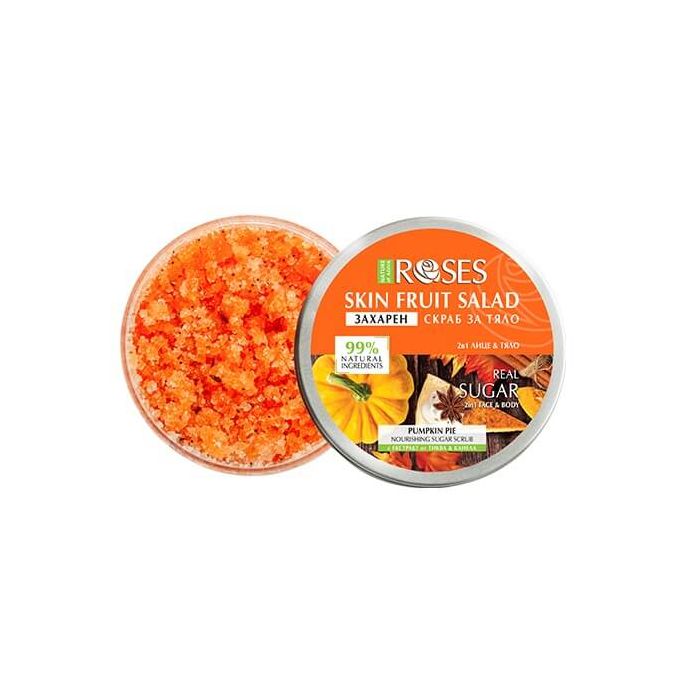 Agiva Roses Skin Fruit Salad Pumpkin Pie Nourishing Sugar Scrub e нежен, подхранващ скраб за лице и тяло, който съдържа истинска захар, натурални ексфолиращи частици и натурални масла. Агива Роузес Фрут Салад Скраб за лице и тяло 2 в 1 тиква и канела деликатно ексфолира кожата и ефикасно премахва мъртвите клетки. Той е с 99% натурален състав и осигурява копринено гладка и мека кожа. Подходящ е едновременно за ежедневно измиване и за дълбока ексфолиация на кожата, както за лице, така и за тяло. Притежава изкушаващ аромат на тиквен пай и канела, който създава усещане за уют и релакс.