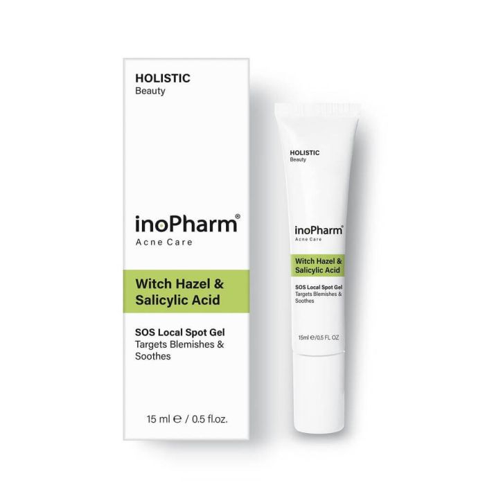 InoPharm Acne Care SOS Local Spot Gel e локален гел с хамамелис и салицилова киселина. Подходящ за мазна и склонна към несъвършенства кожа. Инофарм Акне Кеър Локален гел е бързо абсорбиращ се прозрачен гел, който намалява зачервяването, като същевременно успокоява и облекчава кожата. Създаден за целенасочена грижа, за да подпомогне по-чистия вид на кожата, без да я изсушава. Без аромат. Дерматологично тестван.