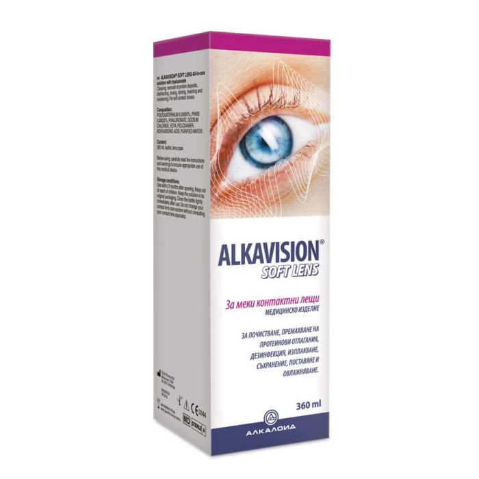 Alkavision Soft Lens Разтвор за меки контактни лещи 360 мл Alkaloid е висококачествено стерилно медицинско изделие. Алкавижън Софт Ленс Разтвор за меки контактни лещи Алкалоид е предназначен за почистване, дезинфекция, изплакване, съхранение и овлажняване на меки контактни лещи. Продуктът е изключително подходящ за хора с чувствителни очи. Специалната му формула се отличава със съдържанието на хиалуронат, овлажняващ лещите и удължаващ периода им на износване. Овлажняването се запазва през целия ден, като това допринася и за комфорта по време на употребата на лещите. Предпазва очите от сухота и раздразнения. Киселинността на разтвора е съобразена с нуждите на окото.
