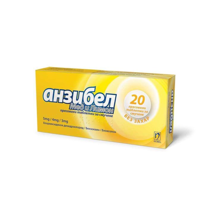 Анзибел мед и лимон е лекарствен продукт без лекарско предписние, под формата на таблетки за смучене за локално и временно симптоматично облекчаване на умерени инфекциозни и възпалителни състояния на устната кухина. Anzibel honey and lemon представлява комбинация от хлорхексидинов дихидрохлорид, бензокаин и еноксолон. Хлорхексидин е с широкоспектърно антиомикробно действие върху грам положителни и грам отрицателни бактерии, като разгражда цитоплазмената мембрана на бактериалните клетки. Бензокаин представлява повърхностен анестетик, който осигурява незабавно и продължително облекчение на болките в гърлото и устата. Еноксолон се извлича от билката сладък корен и има силни противовъзпалителни и успокояващи свойства.
