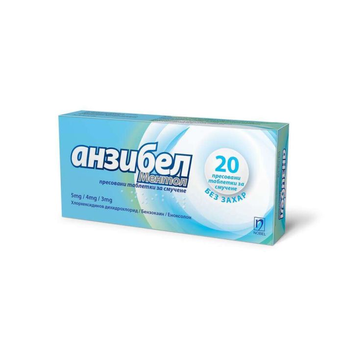Anzibel mentol е лекарствен продукт без лекарско предписание, под формата на таблетки за смучене, за локално и временно симптоматично облекчаване на умерени инфекциозни и възпалителни състояния на устната кухина. Анзибел ментол представлява комбинация от хлорхексидинов дихидрохлорид, бензокаин и еноксолон. Хлорхексидин е с широкоспектърно антиомикробно действие върху грам положителни и грам отрицателни бактерии, като разгражда цитоплазмената мембрана на бактериалните клетки. Бензокаинът представлява повърхностен анестетик, който осигурява незабавно и продължително облекчение на болките в гърлото и устата. Еноксолонът се извлича от билката сладък корен и има силни противовъзпалителни и успокояващи свойства.