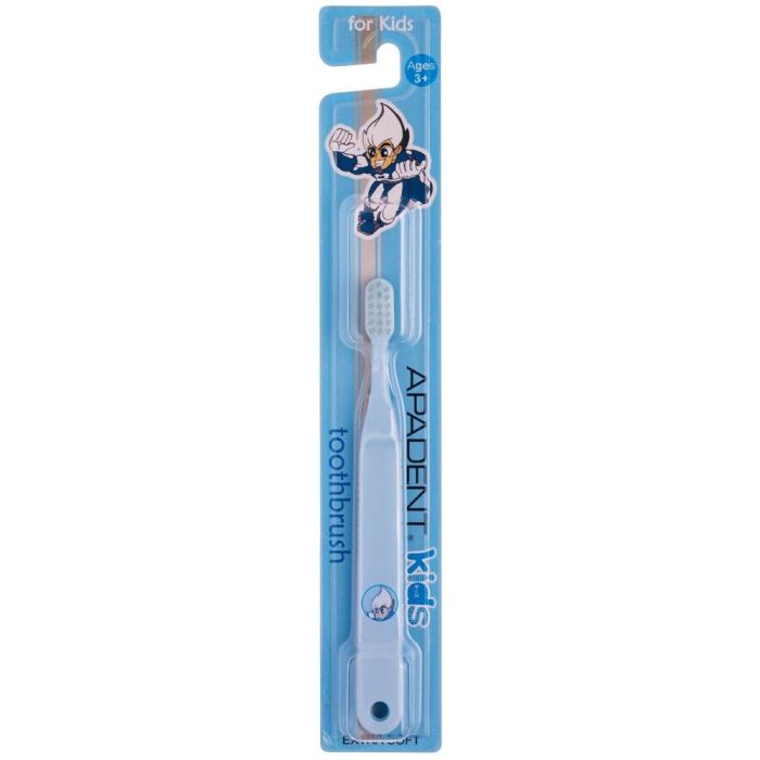 Ападент Кидс Четка за зъби 3+ години Екстра Софт е с меки влакна със заоблен връх, осигуряващи изключиелно нежна грижа към зъбите и венците на малките деца. Удобна, неплъзгаща се дръжка. Компактна глава, която улеснява миенето на зъбите. Влакната освобождават отрицателни йони и спомагат за премахване на плаката. Съдържат оригиналния антибактериален агент APACIDER TM на SANGI.