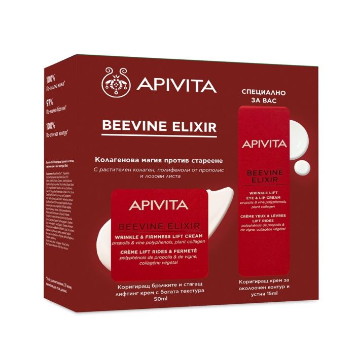 Комплектът съдържа: Apivita Beevine Elixir Коригиращ бръчките и стягащ дневен крем с богата текстура 50 мл 1 бр + Apivita Beevine Elixir Коригиращ бръчките и стягащ крем за околоочен контур и устни 15 мл 1 бр.