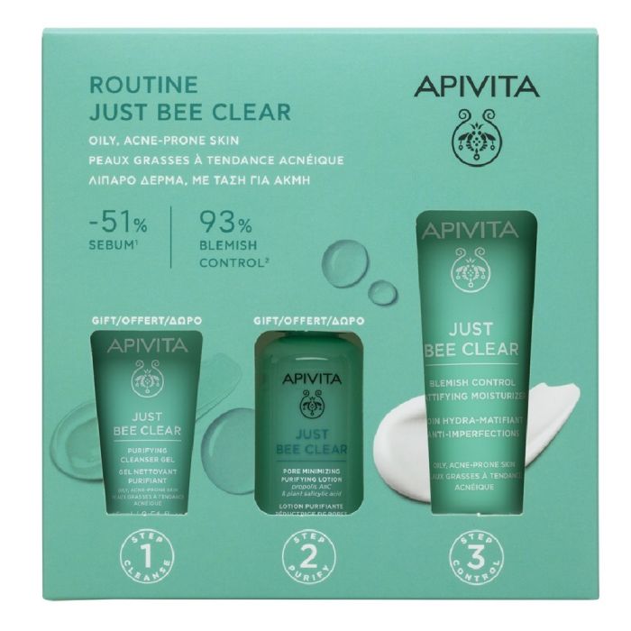 Комплектът съдържа: Apivita Just Bee Clear Хидратиращ матиращ крем 40 мл 1 бр + Apivita Just Bee Clear Почистващ гел за лице 15 мл 1 бр + Apivita Just Bee Clear Пречистващ лосион 50 мл 1 бр.