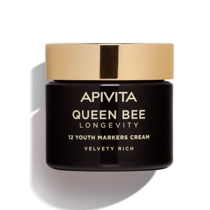 Apivita Queen Bee Longevity 12 Youth Markers Creme Velvety Rich e богат кадифен крем против стареене. Подходящ за суха кожа. Формулата съчетава патентованите Royal Jelly-IR и Royal Jelly-CR, капсулирани в иновативни системи за доставяне и по-дълбоко ефективно действие. Те подпомагат регенерацията на дермата и възстановяват и подобряват енергията, и метаболизма на клетките, докато растителните екзозомни пептиди подсилват устойчивостта и здравината на кожата. Апивита Куин Бий Дневен лек крем за лице против стареене е с богата кадифена текстура, която подобрява обема и плътността на кожата, видимо намалява бръчките и тъмните петна и оставя нежен, немазен завършек. Съдържа 96% натурален състав. Без парабени. Дерматологично тестван продукт. Некомедоногенен.