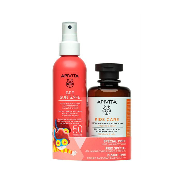Комплектът съдържа: Apivita Bee Sun Sаfe Слънцезащитен спрей за деца SPF50 200 мл 1 бр + Подарък: Apivita Kids Care Нежен детски измиващ гел за коса и тяло 250 мл 1 бр.
