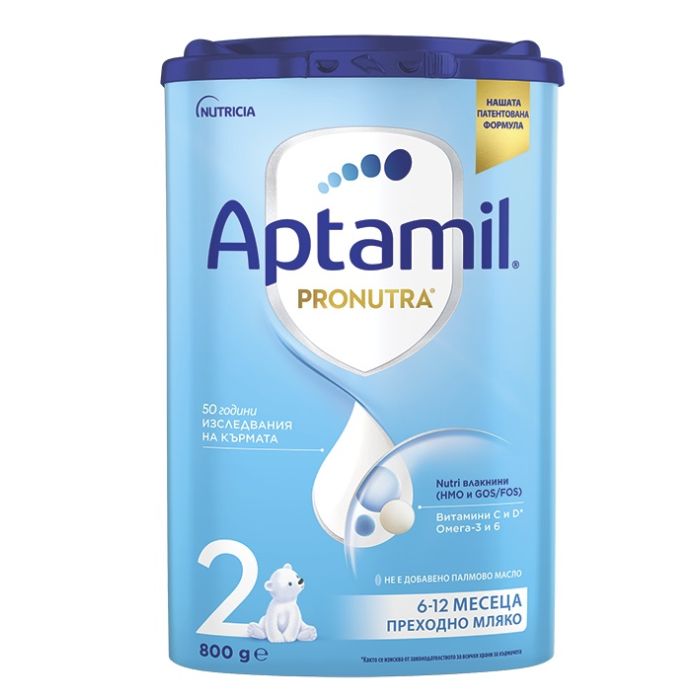 Aptamil Pronutrа 2 6-12 Months e специално създадено, за да отговори на хранителните нужди на бебето между 6 и 12 месеца. Обогатено е с омега-3 (DHA) и омега-6 (АА) мастни киселини, Nutri влакнини НМО и GOS/FOS, необходими за растежа и развитието на бебето. Аптамил Пронутра 2 преходно мляко 6 м-12 м е разработено именно, за да помогне за адаптацията и да осигури всички необходими хранителни съставки за бебетата от 6 до 12 месеца. Съдържа витамин витамин А, витамин C и D*. В голяма, икономична опаковка. Млеката Аптамил трябва да се използват само след препоръка на медицинско лице. Ако детето привикне да се храни с биберон и бутилка, може след това да откаже, да бъде кърмено. По време на хранене, детето трябва да бъде наблюдавано от възрастен. Никога не оставяйте бебето само по време на хранене! Спазвайте стриктно инструкциите за приготвяне на млеката! Ако не е приготвено правилно, има риск да навреди на здравето на вашето дете! След шестия месец е добре за детето, да започнете да въвеждате и други храни към диетата му.