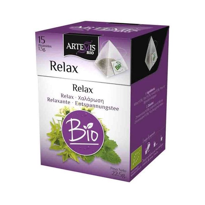 Relax Artemis Bio е растителен букет от натурални билки, които подпомага намаляването на ежедневния стрес и нервното напрежение. Комбинацията притежава деликатн вкус и мек аромат. Био Чай за спокоен сън Артемис Био е подходящ при проблеми със съня, при преумора, нервност, притежава антидепресивно и ободряващо действие. Чаят намалява ежедневия стрес, като въздейства успокояващо и релаксиращо. Той е особено подходящ за по-бърза адаптацията на организма при стресови ситуации и периоди на прекомерна физическа или умствена активност. Маточината е богат източник на витамини, минерали и антиоксиданти, сред които витамин D, манган, теанин, лутеолин, апигенин, монотерпенови гликозиди и много други. Тя спомага за намаляване на безпокойството и насърчаване на съня, редуциране на симптоми като безсъние, тревожност, действа успокояващо на нервната система, има антиспастично и противогърчово действие. Лимоновата върбинка има приятен цитрусов аромат и успокояващ и релаксиращ ефект върху нервната система - намалява напрежението, тревожността и стреса. Свойствата на върбинката благоприятстват и при нарушения на съня. Билката тила е естествен седатив. Положителният й ефект се дължи на способността и да отпуска мускулите и сваля нервното напрежение. Освен ползите за нервната система, тила е богата на антиоксидантни съединения, които спомагат да поддържаме тялото си здраво.