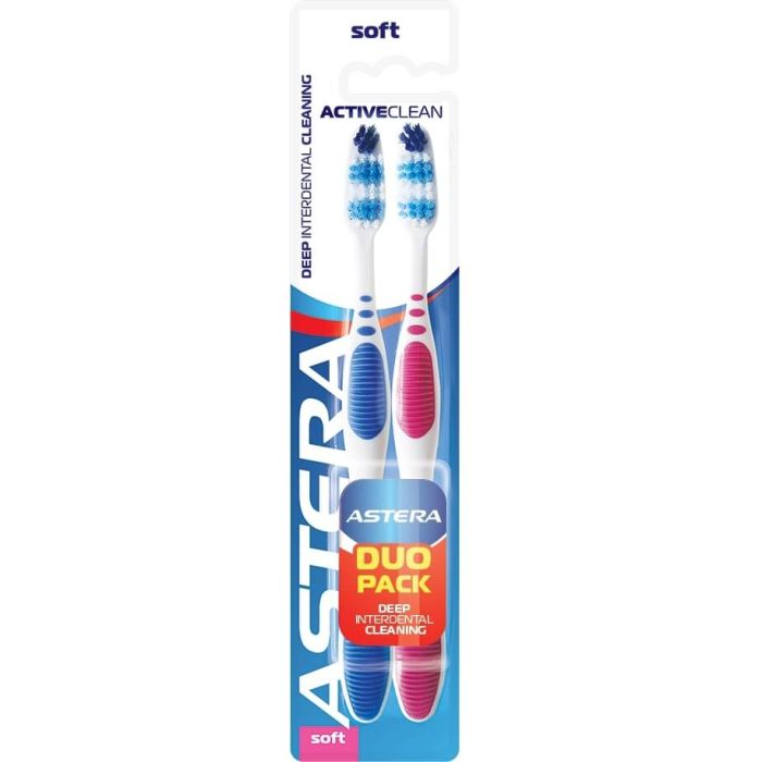 Astera Active Clean Soft Четка за зъби 1+1 е удобен и ефективен избор за всеки, предпочитащ средни по твърдост четки за зъби. Астера Актив Клийн Софт Четка за зъби 1+1 се предлга в икономичен семеен комплект от две четки в различни цветове. Astera Active Clean Soft разполага с наклонени снопчета, които гарантират ефикасното почистване на пространствата между зъбите. Освен това краищата на 2000-те влакна на четката са специално полирани, така че задържането на бактерии по главата на четката е невъзможно. А ергономичната й форма и гумените участъци спомагат добрия захват и пълния комфорт по време на миенето на зъбите.