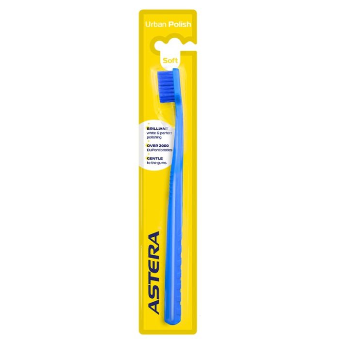 Astera Urban Polish Toothbrush е качествена четка за зъби със силен полиращ ефект. Астера Ърбан Полиш Четка за зъби с полиращ ефект осигурява професионално почистване на устната кухина в домашни условия. Снопчетата на главата на четката се отличават с нежност и мекота и се отнасят деликатно към венците. Освен това успяват да достигат и почистват отлично междузъбните пространтва, както и плаката от повърхността на зъба. Четката осигурява още блестящо избелване и перфектно полиране благодарение на своите над 2 000 DuPont влакна. Гуменото покритие на дръжката предпазва от хлъзгане по време на употреба. Предлага се в 4 различни цвята - син, зелен, розов, жълт. Мека четка.
