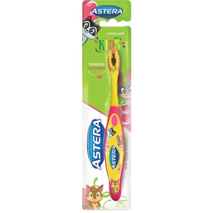 Astera Kids Extra Soft Четка за зъби е четка за зъби с изключително меки влакна, специално създадена за деца между 2 и 6-годишна възраст. Астера Кидс Екстра Софт Четка за зъби е с фино полирани и заоблени краища на влакната, така че задържането на бактерии по главата на четката е невъзможно. Четката има гумирана част за лесно почистване на езика. Главата на четката също е гумирана, за да предпазва детето от наранявания, с удобна гумирана дръжка с пръстовиден захват.