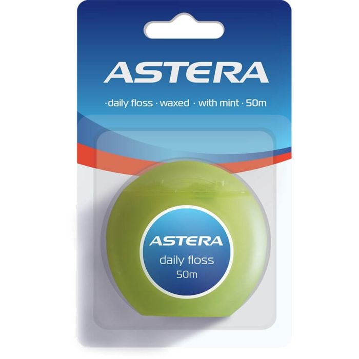 Astera Active Конец за зъби e разработен така, че ефективно и лесно да почиства междузъбните пространства. Астера Актив Конец за зъби е специално импрегниран с восък, за да осигури лесно движение и плъзгане. А благодарение на плоската си структура конецът за зъби Астера Актив влиза в междузъбните пространства без никакви затруднения. За свежест и комфорт след употребата му допринася неговият ментов аромат, а флуорът в състава му играе ключова роля за антикариесната защита, която конецът Astera Active осигурява.