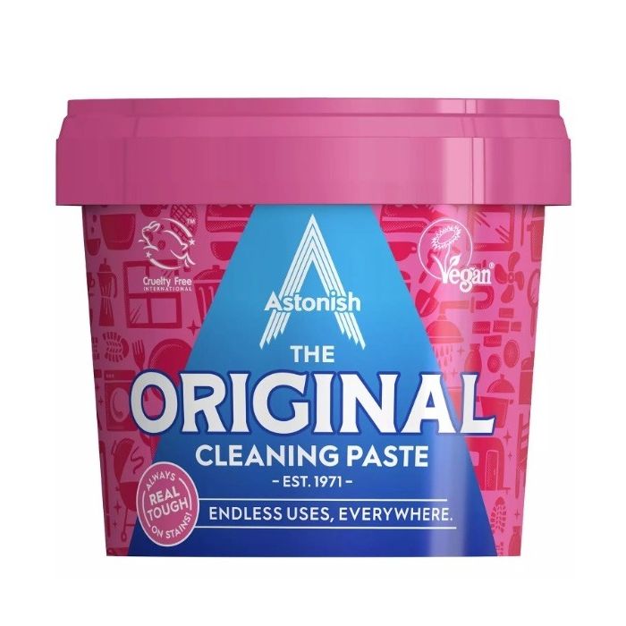 Astonish The Original Cleaning Paste е създадена ефективно да разгражда замърсявания, мазни петна и натрупана мръсотия, като възвръща свежия вид на различни предмети. Астониш Ориджинал Паста за почистване не съдържа агресивни химикали, затова не е необходимо използването на ръкавици. Намира широко приложение, може да се използва върху душ кабини, емайлирани повърхности, аспиратори, градински инструменти, смесители, фуги, врати, стъкло, пластмаса, стомана и още много други.