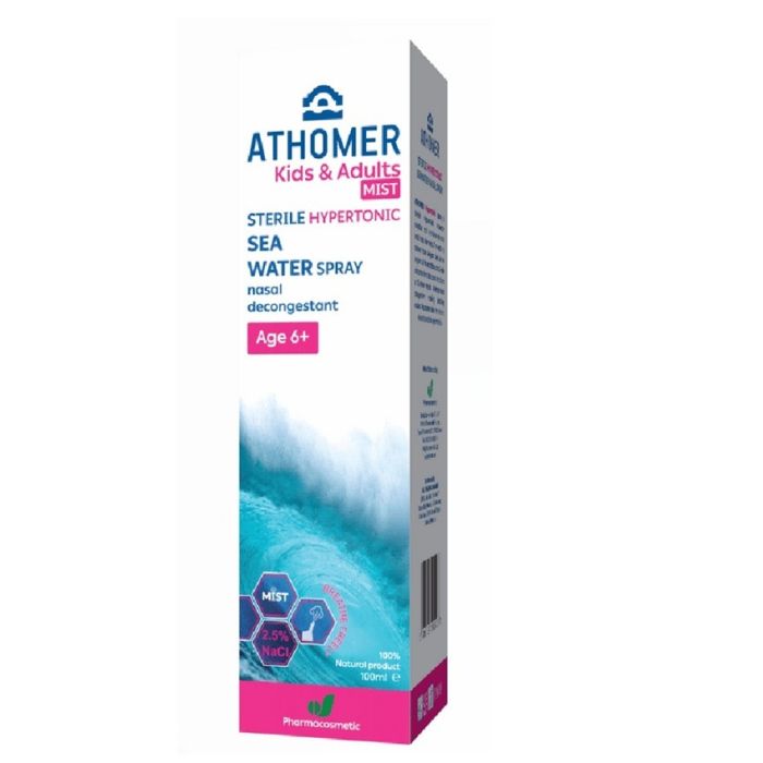 Athomer Hypertensive Nose Spray е хипертоничен спрей за нос, съдържащ натурален разтвор на морска вода, който въздейства благоприятно на назалната лигавица. Хипертоничният разтвор е 100% стерилен. Атомер Хипертоничен спрей за нос е богат на морски минерали и микроелементи като калций, калий, магнезий и други. Облекчава запушването на носа като улеснява дишането, препоръчва се при хроничен синузит и алергичен ринит.