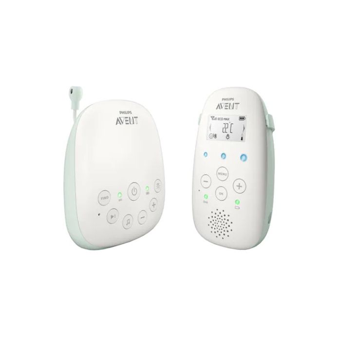 Аудио бебефон DECT Philips Avent SCD711/52 е висококачествен и удобен за ползване бебефон. Аудио бебефон ДЕКТ Филипс Авент СЦД711/52 е създаден по специална DECT технология, осигуряваща сигурна връзка между устройствата, така че никой друг да не може да чуе звука. Освен това тази технология осигурява сигнал без смущения, предизвиквани от други устройства като мобилния телефон или лаптопа например. Технологията DECT осигурява много ясен звук, позволяващ ви да чуете всяко леко кикотене, плач и хълцане на детето. Бебефонът на Авент се отличава и с наличието на режима Smart ECO, който автоматично минимизира мощността на предаване на звука и повишава живота на батерията. Колкото по-близо е приемникът ви до бебето, толкова по-малко енергия се изразходва за поддържане на сигнала. Обхватът на бебефона е до 50 м отвътре и до 330 м отвън. Родителският приемник се използва изключително лесно и работи до 18 часа след едно зареждане. Бебефонът разполага още с индикатори за степента на звука, които отчитат нивото на звука в помещението, където е бебето - дори в случай че родителското устройство е със спрян звук. Родителското устройство също така сигнализира, ако мониторът излезе извън обхват или степента на мощност се понижи. В паметта на устройството ще откриете и 5 релаксиращи песни, които можете да пускате на бебето, за да го приспите по-лесно. Уредът позволява и да комуникирате с детето от разстояние, да го приспивате с вашия глас, като му попеете или говорите. Бебефонът ви показва и температурата в стаята на детето, ако тя се промени рязко, апаратът ще ви сигнализира. Уредът разполага и с удобна докинг станция за зареждане. Устройството работи на батерии тип AA. В опаковката ще откриете клипс за каишка, устройство за детето, родителско устройство, 2 адаптера за захранване.