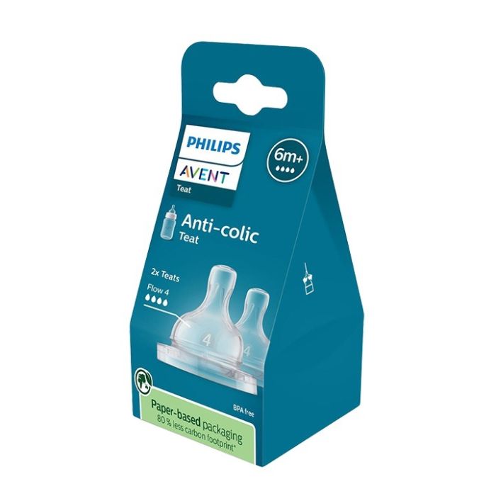 Avent Anti-colic Fast Биберон за бебета със силен поток 6М+ x 2 бр са биберони, които осигуряват бърз поток на млякото. Подходящи за деца над 6 месеца. Те позволяват естествена позиция при засукване и улесняват комбинирането на кърмене и хранене с шише. Те са проектирани за хранене без прекъсване. Авент Антиколик Фаст Биберон за бебета със силен поток 6М+ x 2 бр са с вградена анти-колик клапа, която се огъва в ритъма, с който се храни бебето, като пропуска въздуха в шишето, а не в стомахчето му. Бибероните са изработени от мек и чист медицински силикон. Имат уникални зони, подобни на венчелистчета, които правят биберона мек и еластичен и помагат за естественото прилепване към устните на бебето, наподобявайки кърмене. Не капят и предотвратяват изтичането на мляко. Бибероните от серията Anti-colic са съвместими само с шишета серия Anti-colic на Avent. Без бисфенол А.