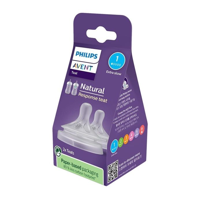 Avent Natural Response Силиконов биберон със слаб поток 0М х 2 бр е биберон, наподобяващ естественото кърмене, тъй като работи с естествения ритъм на хранене на бебето. Това улеснява комбинирането на кърменето и храненето с бутилка. Биберонът има уникален отвор, който освобождава мляко само когато бебето пие активно. Така че, когато спре, за да поглъща и диша, млякото също спира. Широкият, мек и гъвкав биберон е проектиран да имитира формата и усещането на гърдата, като помага на бебето да засмуква и да се храни удобно. Авент Нейчаръл Риспонс Силиконов биберон със слаб поток 0М х 2 бр има клапа против колики, която е проектирана да държи въздуха далече от коремчето на бебето по време на хранене, за да помогне за намаляване на коликите и дискомфорта. Отворът на биберона е проектиран да освобождава мляко само когато бебето се храни. Така че можете уверено да избегнете загубата на мляко – независимо дали сте у дома, или в движение. Не съдържа бисфенол A.