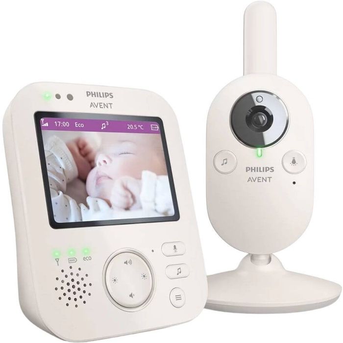 Philips Avent Видео бебефон SCD 891/26 позволява да поддържате сигурна и персонална връзка с вашето бебе по всяко време. Слушайте вашето бебе с отлично качество на звука и го наблюдавайте с кристалночист образ (3,5" LCD; 8,5 cm), независимо дали е ден, или нощ. Филипс Авент Видео бебефон SCD 891/26 има 3,5-инчов цветен екран с висока разделителна способност. С 4x цифрово мащабиране и панорамно придвижване имате допълнителна сигурност, за да може да виждате какво прави вашето бебе. Уникално сдвояване на слушалката осигурява дискретна и сигурна връзка с бебето ви чрез 2,4 GHz технология за безжична връзка за минимални смущения. С висококачествен, кристалночист звук. Енергоспестяващ ECO режим с индикация за връзка. Обхват на закрито до 50 метра. Обхват на открито до 300 метра. Малкото презареждаемо родителско устройство ви дава свободата на безжично наблюдение за до 12 часа, преди да е необходимо зареждане. Ръчно въртене на камерата за цялостен изглед на стаята на бебето. Сензорът за температурата с персонализирано предупреждение ви дава възможност да наблюдавате климата в стаята на бебето. 6 успокояващи мелодии и нощна светлина.