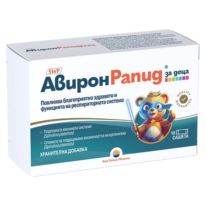 Aviron Rapid Kids е продукт, който представлява комбинация от три клинично доказани съставки с натурален произход и допълващо се действие. Този продукт е предназначен да подпомага естествената защитна функция на организма, особено по време на сезонните предизвикателства на студеното време. Авирон Рапид за Деца при грип и вирусни инфекции повлиява благоприятно здравето и функцията на респираторната система на децата. Съставките на продукта са извлечени от природни източници и са доказани да имат положителен ефект върху здравето и имунната система на децата. Продуктът е специално разработен, за да осигури подкрепа и защита на организма по време на студените месеци и предизвикателствата, свързани със сезонните болести. Естествените съставки в Авирон Рапид за деца са избрани с внимание и са подходящи за малки деца. Те работят синергично, за да подобрят отговора на организма към сезонните предизвикателства и да поддържат оптималното функциониране на респираторната система. Този продукт може да бъде полезен за подкрепа на имунната система на децата и за поддържане на тяхното добро здраве през студените месеци.