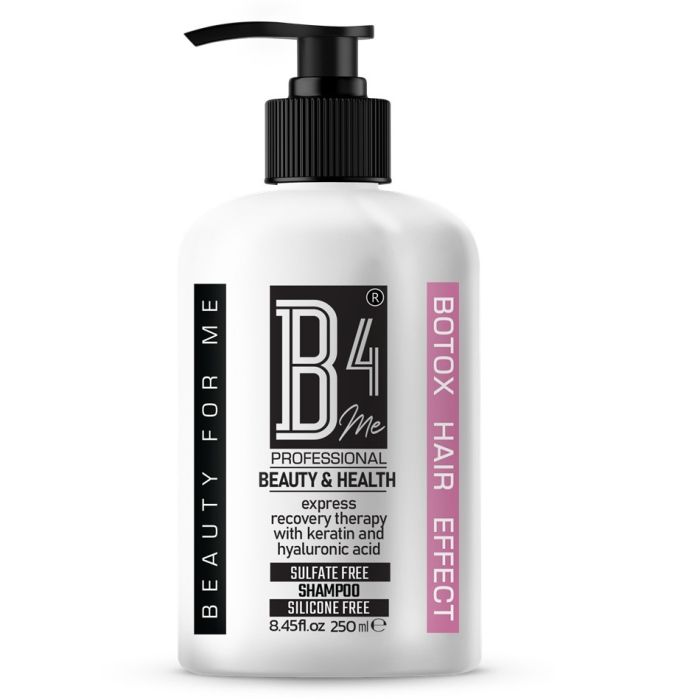 B4Me Silicone-Free Shampoo – Botox Hair Effectе е формула насочена да възстанови в цялост косата. Обогатен с растителни екстракти, шампоанът стимулира растежа, заздравява корена, спомага изглаждането на структурата на косъма. С ботоксо-подобен ефект, шампоанът укрепва косъма, изглажда косата, подхранава, укрепва и възвръща младежкото излъчване на косата. Подкрепя уморената, отслабена и третирана коса. БиФоорМи Безсиликонов шампоан с ботокс ефект не утежнява косата, подхранава и възвръща бялсъка.
