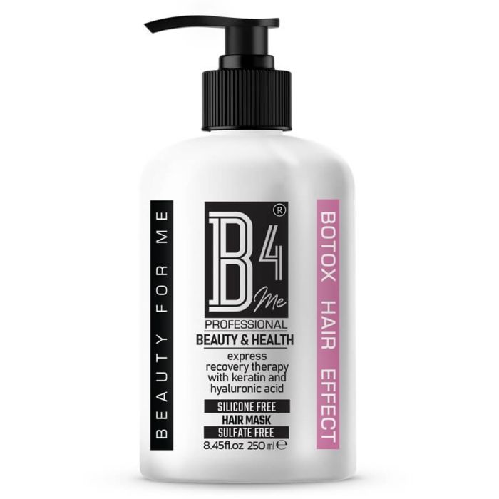 B4Me Silicone-Free Hair Mask – Botox Hair Effectе е формула ограничаваща косопада и стимулираща растежа на косата. Обогатена с растителни екстракти, тя стимулира растежа, заздравява корена, спомага изглаждането на структурата на косъма. Маската притежава ботоксо-подобен ефект, като спомага за възстановяне на младежкото излъчване на косата. Подкрепя уморената, отслабена и третирана коса. БиФоорМи Безсиликонова маска с ботокс ефект не утежнява косата, подхранава и възвръща бялсъка.