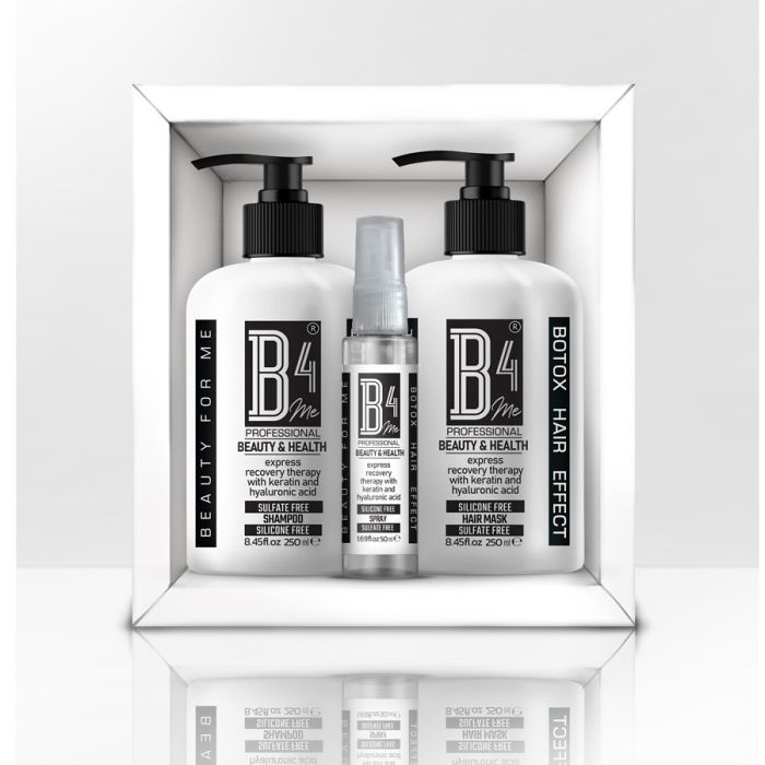 Комплектът съдържа: B4Me Безсулфатен шампоан за изтощена коса с ботокс ефект 250 мл. 1 бр. + B4Me Reconstruction of Damaged Hair Маска без силикони за изтощена коса 250 мл + B4Me Спрей за разресване без отмиване 50 мл. 1 бр.