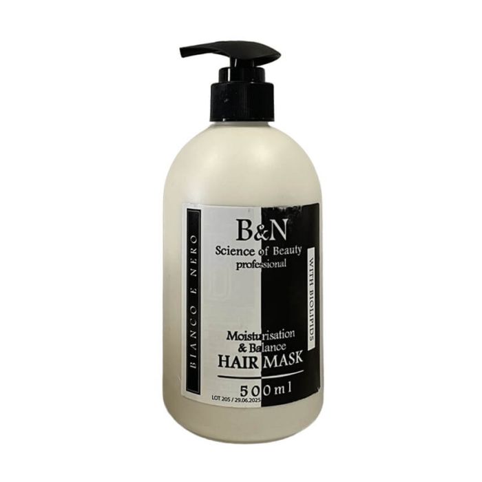 B&N Moisture and balance Hair Mask e маска за суха коса. Формулирана с кокосово масло и глицерин, хидратира в дълбочина и помага за възстановяване на сухите коси. Би енд Ен Хидратираща и балансираща маска за увредена коса има интензивно действие, помага за възстановяването на микробиома на скалпа и намалява трансепидермалната загуба на вода. Биолипидите във формулата спомагат за задържане на влагата в косъма и подсилват неговата липидна бариера. Натуралните масла, които също са част от формулата допринасят за подхранване и блясък, като не увреждат косъма.