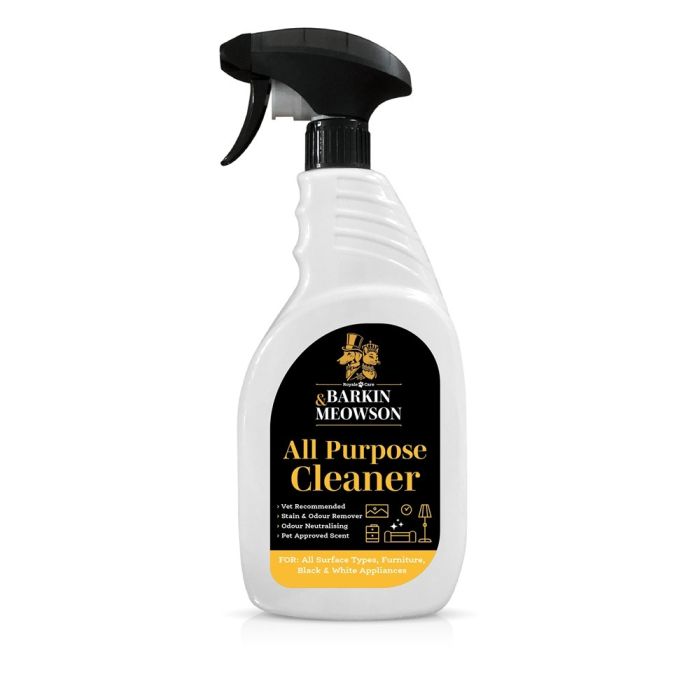 Barkin&Meowson All Purpose Cleaner е препарат за почистване на различни гладки и водоустойчиви повърхности. Подходящ е за използване върху мебели (ПДЧ, МДФ, масивна дървесина, лакирани фурнири), електроуреди (черна и бяла техника), стъкло, пластмаса и алуминиева дограма. Прониква в дълбочина, като ефективно разгражда и премахва замърсявания и петна, включително причинени от домашни любимци. Почиства и освежава, и може да се използва не само в бита, но и в домове за домашни любимци. Ароматът е одобрен от домашните любимци (Лорд Б и Лейди М)* и е с вградена технология за дълготрайно неутрализиране на неприятни миризми. Баркин енд Мяусън Универсален почистващ спрей е препоръчан от ветеринарен лекар.