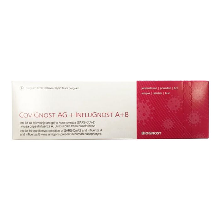 CoviGnost AG + InfluGnost A+B е бърз комбиниран антигенен тест Coronavirus (SARS-CoV-2) и Грип А+В с назофарингеален тампон. Референтни стойности - Положителен/ Отрицателен. Coronavirus (SARS-CoV-2) - Чувствителност - 96.4%, Специфичност-99.2%, Точност - 98.0%. Influenza А Референтни стойности - Положителен/ Отрицателен. Чувствителност - 95.0%, Специфичност-99.1%, Точност - 98.4%. Influenza B Референтни стойности - Положителен/ Отрицателен. Чувствителност - 92.9%, Специфичност-99.1%, Точност - 98.1%. Резултат до максимум 15 минути. Единично опакован в оригинална опаковка от производителя.