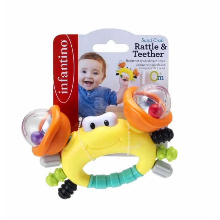 Infantino Бебешка дрънкалка и гризалка 2в1 е във формата на пясъчен рак със забавни тракащи щипки. Текстурирани крачета за никнене на зъби. Отлична звукова и тактилна стимулация за растящи бебета. Infantino Бебешка дрънкалка и гризалка 2в1 има сигурна дръжка за носене.