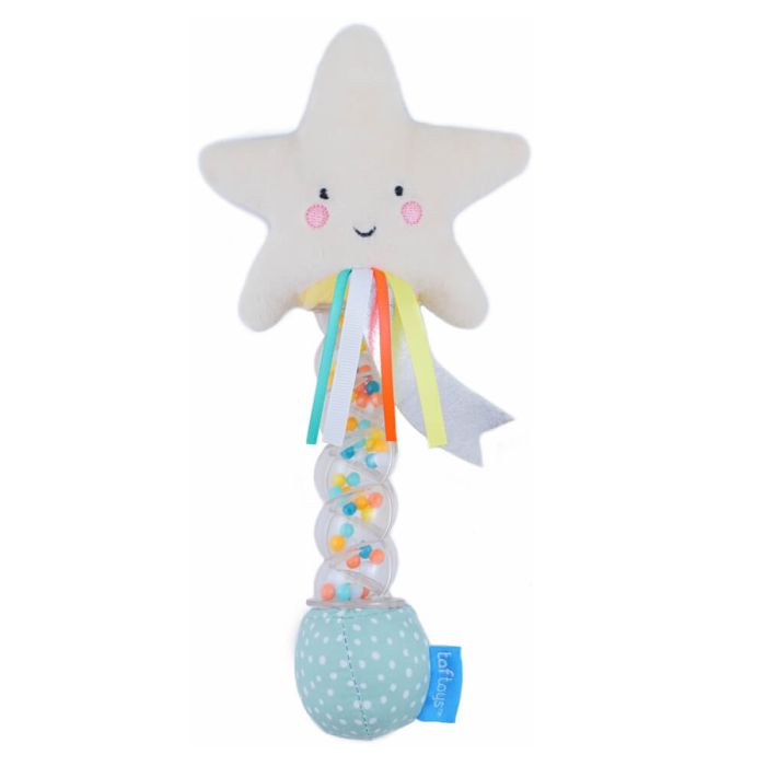 Taf Toys Бебешка мека дрънкалка на стик Звезда е удобна и лесна за хващане. Издава успокояващи звуци на дъждовна капка, които малките ще харесат. Има плюшена звезда и цветни панделки, които стимулират тактилното развитие. Формата е подходяща за хващане от малките детски ръчички. Заниманията с играчката помагат за развитието нa двигателните умения и емоционалната интелигентност на бебето. Таф Тойс Бебешка мека дрънкалка на стик Звезда е перфектна за стимулиране на фината моторика. Забавната играчка насърчава зрителните, слуховите и тактилните сетива. Захващането, разклащането и следенето на падащите топчета развива координацията, логическото мислене, изгражда първоначална представа за ритъм и звук и спомага за развитието на ловкостта и сръчността у най-малките. Дрънкалката е изработена от разнообразни материали, отговарящи на европейските изисквания за безопасност. Без ВРА и фталати. Моделът е подходящ за дечица още от момента на тяхното раждане.
