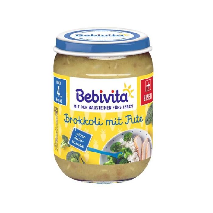 Bebivita Броколи и пуешко без глутен 4М+ е подходящо за деца над 4-месечна възраст с балансиран състав и приятен вкус - нещо ново в менюто на малките деца. Бебивита Броколи и пуешко без глутен 4М+ е с фина консистенция и лесно за усвояване. Богато на витамини и минерали, съдържа желязо. Съдържанието на сол е в резултат от естественото съдържание на натрий в съставките. Не съдържа глутен, аромати, консерванти, млечни продукти, оцветители, сгъстители.
