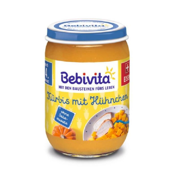 Bebivita Тиква, пилешко и ябълка без глутен 4М+ е за бебета над 4-месечна възраст. Продуктът въвежда нов вкус в менюто на вашето дете. Бебивита Тиква, пилешко и ябълка без глутен 4М+ е с балансиран вкус и с приятна консистенция и се превръща в любима храна на вашия малчуган. Съдържанието на сол е в резултат от естественото съдържание на натрий в съставките. Не съдържа глутен, аромати, консерванти, млечни продукти, оцветители,сгъстители.