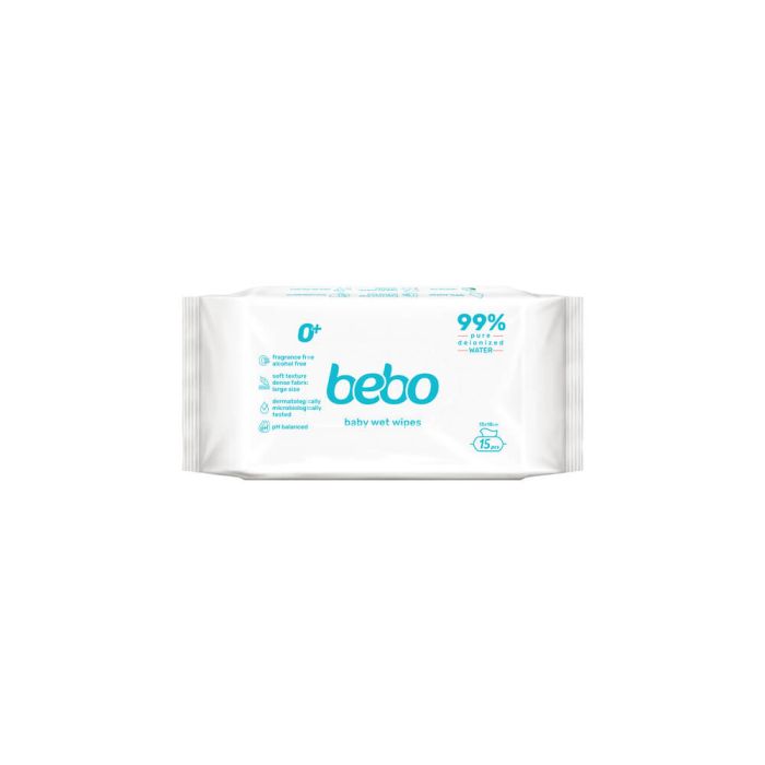 Bebo baby wet wipes са специално разработени за свръх чувствителната бебешка кожа. Подходящи са за всекидневна хигиенна грижа. Бебо Мокри кърпи 99% вода нежно почистват, освежават и овлажняват. Съдържат йонизирана вода, която предпазва от развитието на микроорганизми върху кожата. Подходящи са за употреба както за бебето, така и от цялото семейство. Без аромати. Без алкохол (етанол). Без минерално масло. Без силикони. Дерматологично тествани.