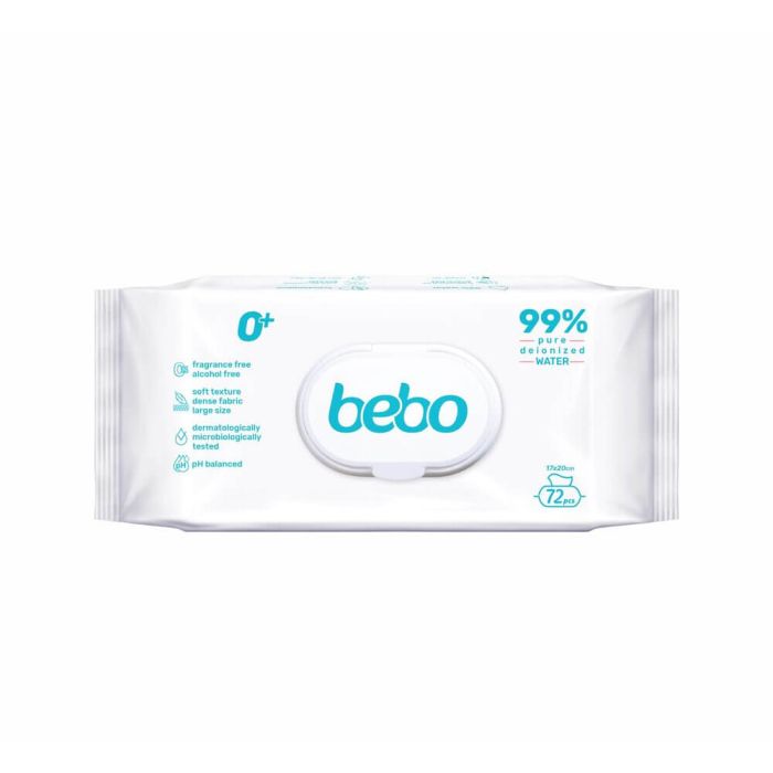 Bebo Влажни кърпички с 99% вода с капак специално произведени за свръх чувствителната бебешка кожа. Подходящи са за всекидневна хигиенна грижа. Бебо Мокри кърпички с 99% вода с капак нежно почистват, освежават и овлажняват. Съдържат йонизирана вода, която предпазва от развитието на микроорганизми върху кожата. Подходящи са за употреба както за бебето, така и от цялото семейство. Без аромати. Без алкохол (етанол). Без минерално масло. Без силикони. Дерматологично тествани.