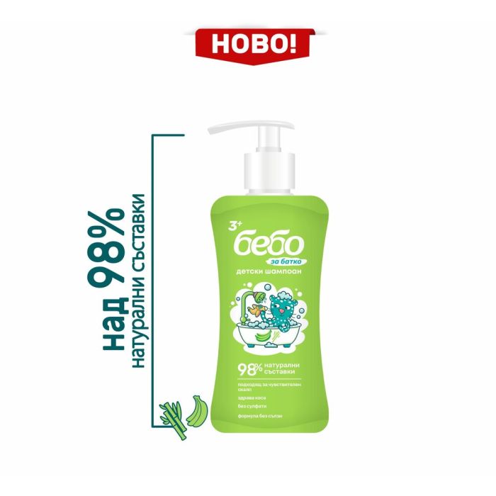 Bebo Детски шампоан зелен банан и бамбук натурален е специално разработен за деца над 3-годишна възраст. Той е безсулфатен шампоан за ежедневна употреба. Бебо Детски шампоан зелен банан и бамбук натурален е обогатен с протеинов комплекс за здрава коса и кожа. Той запазва рН баланса на скалпа, хидратира и улеснява разресването на косата. Не дразни очите, без пенители.