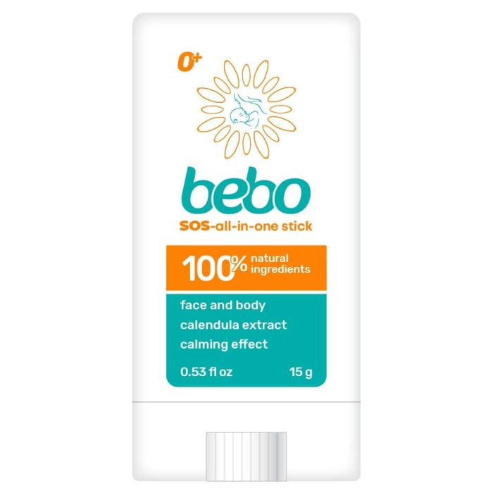 Bebo SOS All-in-one stick е подходящ от първия ден след раждането, осигурява ежедневна защита и възстановяваща грижа срещу студ, вятър, влага и кожни раздразнения. Формулата с екстракт от невен успокоява, подхранва и омекотява, а текстурата се разтапя при допир с кожата, попива лесно и не оставя следи. Бебо SOS Многофукционален стик е подходящ за цялото семейство – за всяка ситуация, в която кожата има нужда от бързо облекчение и защита.
