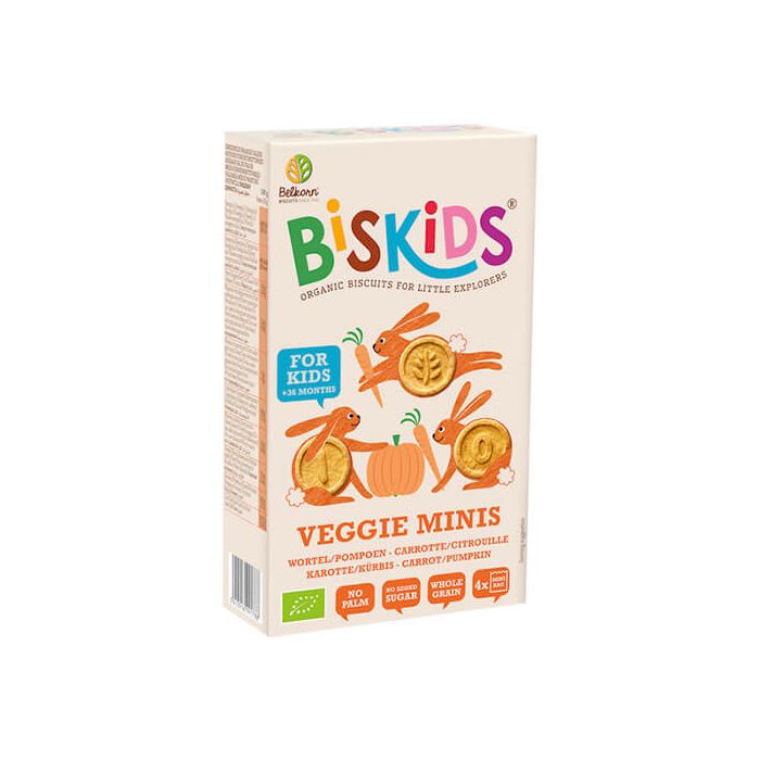 Belcorn Био детски бисквити с морков и тиква са подходящи за деца над 3 години, източник на фибри, без добавена захар и с интересен червен цвят. Кръглата им форма е с размер, подходящ за детски ръце. Имат естествена сладост, без палмова мазнина. Хрупкави и вкусни, Белкорн Био детски бисквити с морков и тиква са добър вариант за междинна закуска на вашето дете.