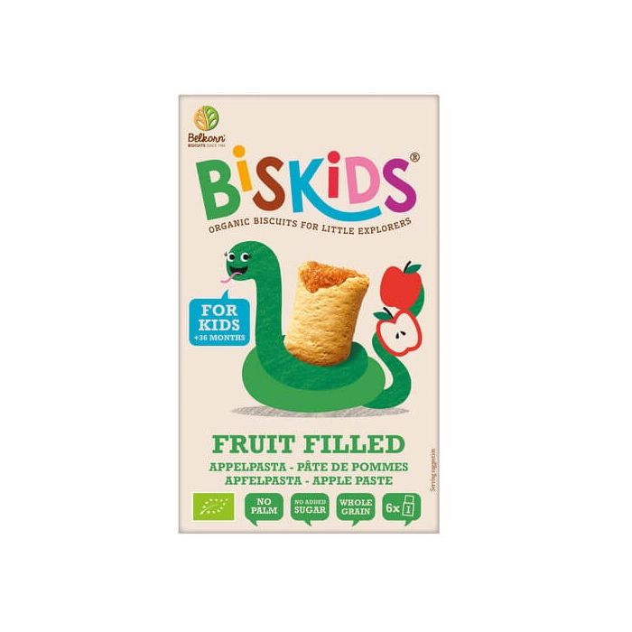 Belcorn Био пълнозърнести бисквити за деца с ябълков пълнеж са подходящи за детето след 3-годишна възраст, не съдържат палмова мазнина и добавена захар, и са произведени с натурални съставки. Белкорн Био пълнозърнести бисквити за деца с ябълков пълнеж се харесват от децата, хрупкави и вкусни, с нежна плодова сърцевина. Размерът на бисквитите е съобразен с малките детски ръце.