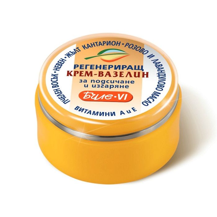 Bille VI Regenerating Cream Vaseline for Cutting and Burning е регенериращ крем-вазелин, който е специално създаден за грижа при подсичане и изгаряния. Ефективната му формула помага за облекчаване на засегнатите зони, като ги подхранва в дълбочина, хидратира ги и ги укрепва. Биле ВИ Регенериращ крем-вазелин при подсичане и изгаряния съдържа пчелен восък, невен, жълт кантарион, розово и лавандулово масло. Богатия комплекс от натурални съставки повишава регенеративните и защитните функции на кожата и има освежаващ ефект.