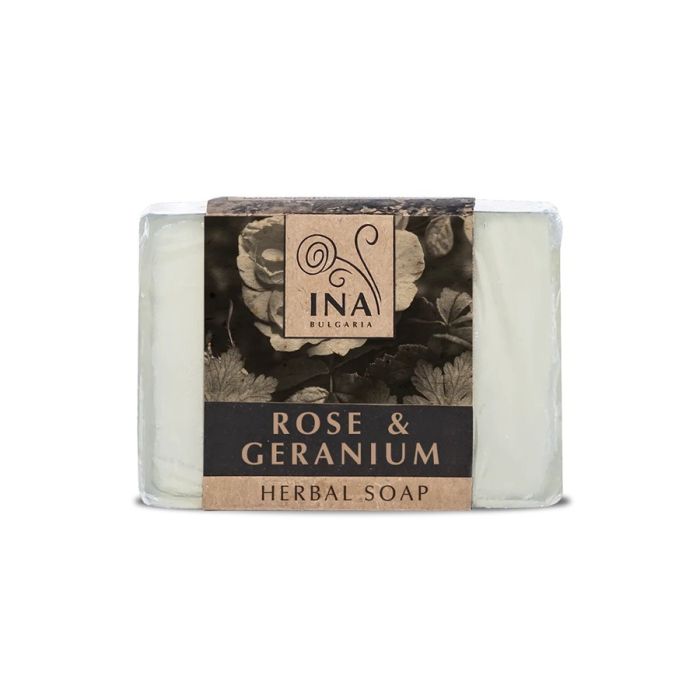 Ina Essentials Rose & Geranium е натурален билков сапун, обогатен с масло от Роза Дамасцена, гераниум и Поморийска луга. Формулата му има силно подхранващо действие, което го прави особено подходящ за суха и изтощена кожа. Сапунът успокоява, подхранва и подпомага предотвратяването на ранните признаци на стареене като фини линии и бръчки. Произведен чрез технология на студено пресоване, той съхранява в максимална степен активните съставки и техните полезни свойства. С нежното си почистващо действие Ина Есеншъл Натурален Билков сапун с масло от Роза Дамасцена, Гераниум и Поморийска луга щади кожата, като същевременно я подхранва и подпомага естествените процеси на възстановяване. С приятен лек аромат.