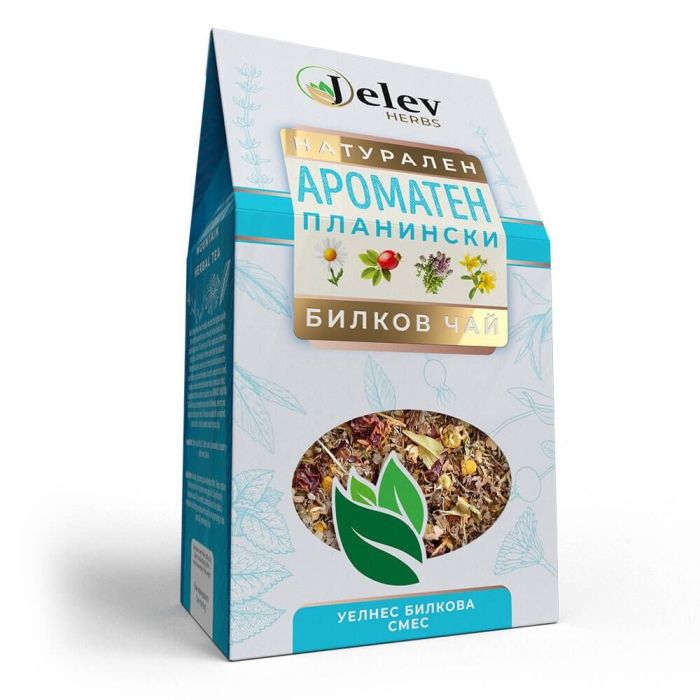 Jelev Herbs Билкова смес Ароматен Планински чай е част от колекцията бутикови смеси и впечатлява със завладяващ аромат, който стимулира сетивата. Всички билки са ръчно подбрани от Родопа планина, за да се гарантира тяхното качество и свежест, а съчетанието им създава хармония между вкус, аромат и действие. Комбинацията включва мащерка, шипка, жълт кантарион, лайка, лист малина и мента, които подпомагат възстановяването на тялото и ума, балансират нервната система и подобряват настроението. Желев Хербс Билкова смес Ароматен планински чай е подходящ както за стимулиращо начало на деня, така и за релакс преди сън.