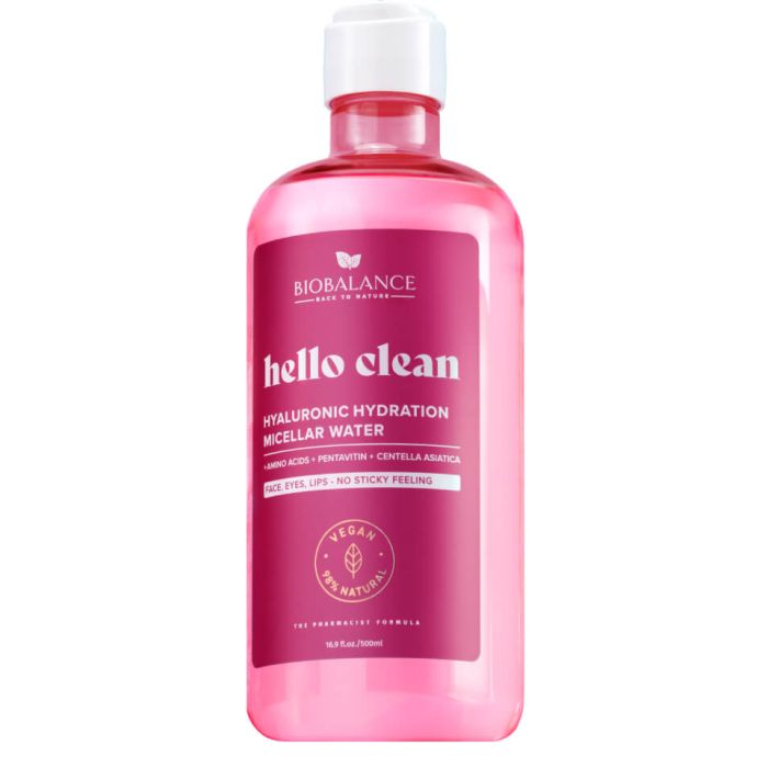 BioBalance Hello Clean Hyaluronic Hydration Micellar Water е мицеларна вода за суха и чувствителна кожа. БиоБаланс Хелоу Клийн Мицеларна вода с хиалурон осигурява интензивна хидратация, изглажда кожата и подобрява блясъка за по-гладък външен вид. Дълбоко почиства мръсотията и грима, като същевременно помага за предотвратяване на запушени пори. Благодарение на мощната си комбинация от хиалуронова киселина, аминокиселинен комплекс, пентавитин и центела азиатска, подхранва кожата, изглажда я и подобрява нейното излъчване за по-ярък и гладък тен.