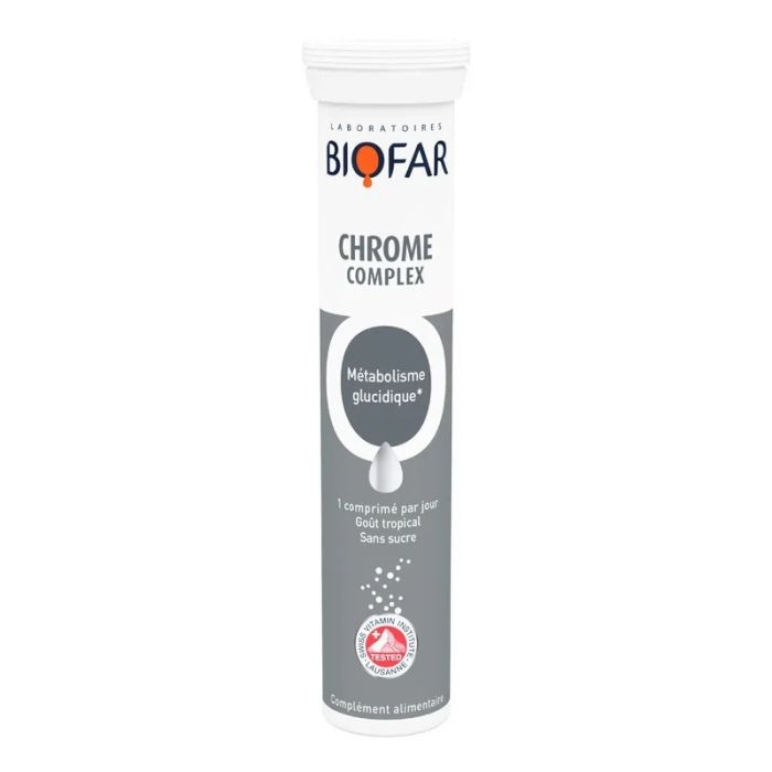 Biofar Chrome Complex е хранителна добавка, която допринася за нормалния метаболизъм на хранителните вещества, както и за нормалната функция на нервната система. Биофар Хром Комплекс се предлага под формата на разтворими таблетки с приятен плодов вкус, като всяка таблетка съдържа комбинация от важни витамини и минерали, които помагат организма. Спомага за балансиране на кръвната захар.
