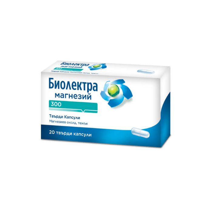 Biolectra Magnesium 300 е лекарствен продукт, който се отпуска без рецепта, под формата на твърди капсули. Биолектра Магнезий 300 твърди капсули се използва при недостиг на магнезий, когато той е причина за нарушения в мускулната дейност (нервномускулни нарушения, крампи/спазми на подбедрицата).